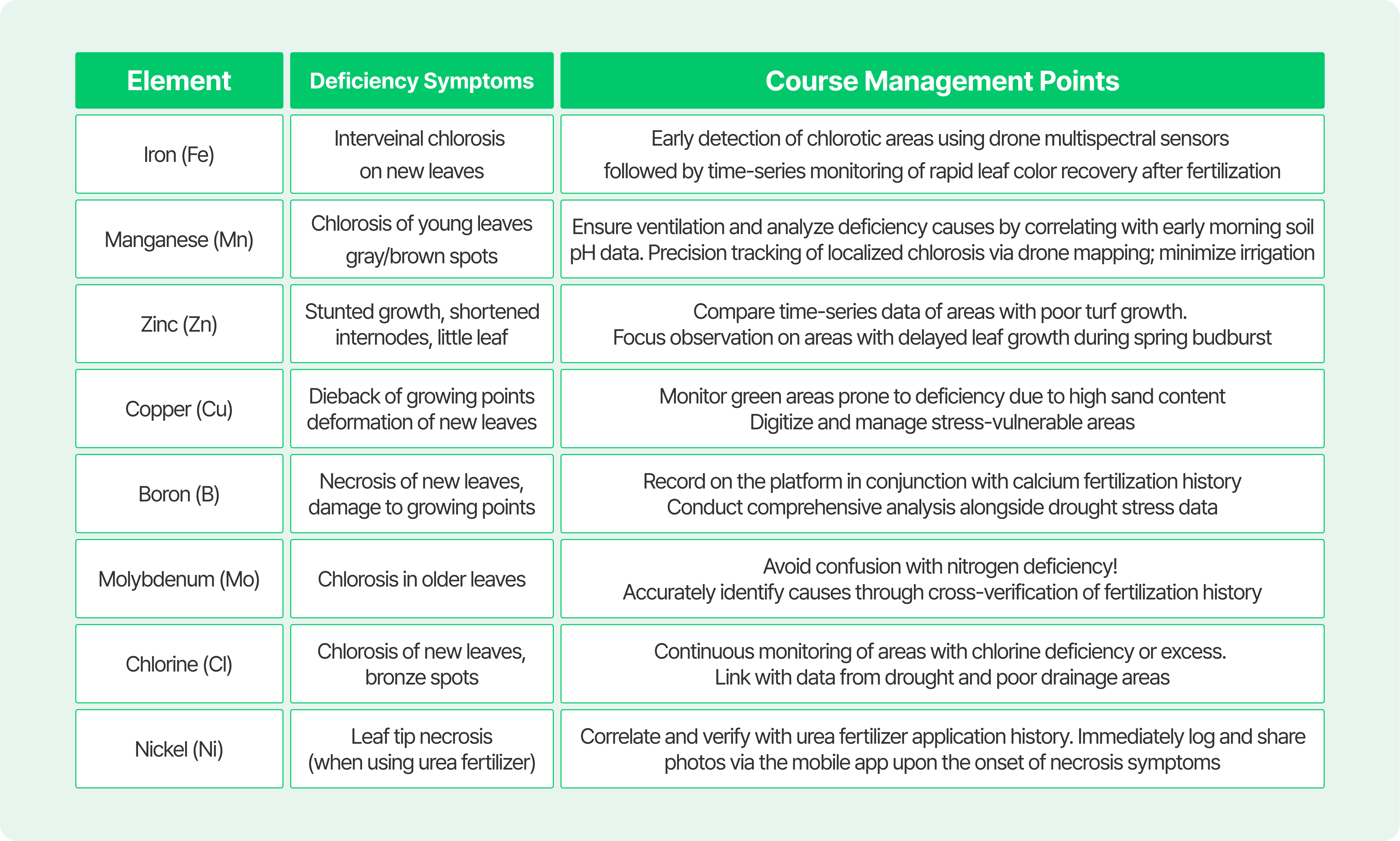 A.In an emergency, you can take preliminary action based on the Superintendent's experience. However, blind fertilization can cause an 'antagonistic effect,' where an excess of one element blocks the absorption of another. It is most efficient to establish a baseline with a pre-season soil test and use drone vegetation data as a supplementary indicator. If it's an emergency, you can take priority action based on the team leader's experience. However, vague fertilization can cause an excess of a specific element and cause an “antagonistic effect” that interferes with the absorption of other elements. It is most efficient to set a baseline with pre-season soil testing and use drone vegetation data as an auxiliary indicator.