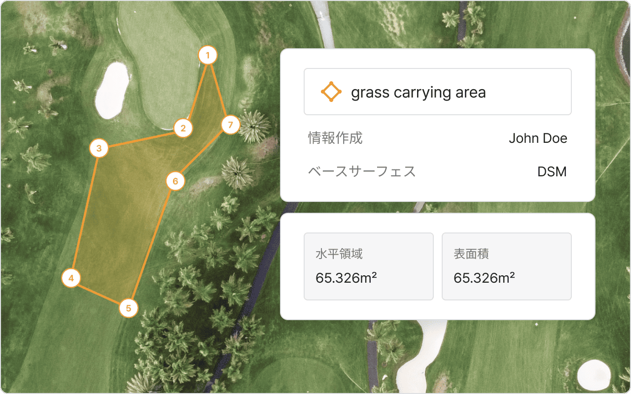 カートでコースを回らなくても、手のひらを見るように鮮明なコースマップで、死角のないコース状況を把握できます。超高精度2Dマップ上で距離や面積を自由に測定でき、測量の外注コストと時間を90%以上削減しながら芝生の精密分析が可能です。
