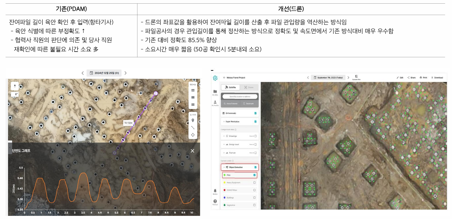 드론 촬영 데이터를 기반으로 파일 위치 좌표와 잔여 파일 길이를 확인하면 파일 관입량을 계산할 수 있습니다. 기존에는 항타기사가 잔여 파일 길이를 육안으로 확인해 입력하는 방식이었지만, 드론 데이터를 활용하면 좌표 기반으로 파일 관입량을 빠르게 확인할 수 있습니다.