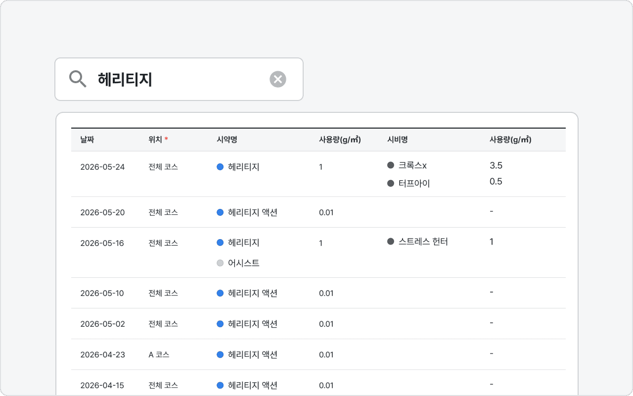 "작년 이맘때 뭐 뿌렸더라?" 고민하며 수첩을 뒤질 필요가 없습니다. 과거의 시약 시비 사용량을 1초 만에 검색해 현재 문제의 원인을 분석하고, 가장 정확한 처방을 내려보세요.