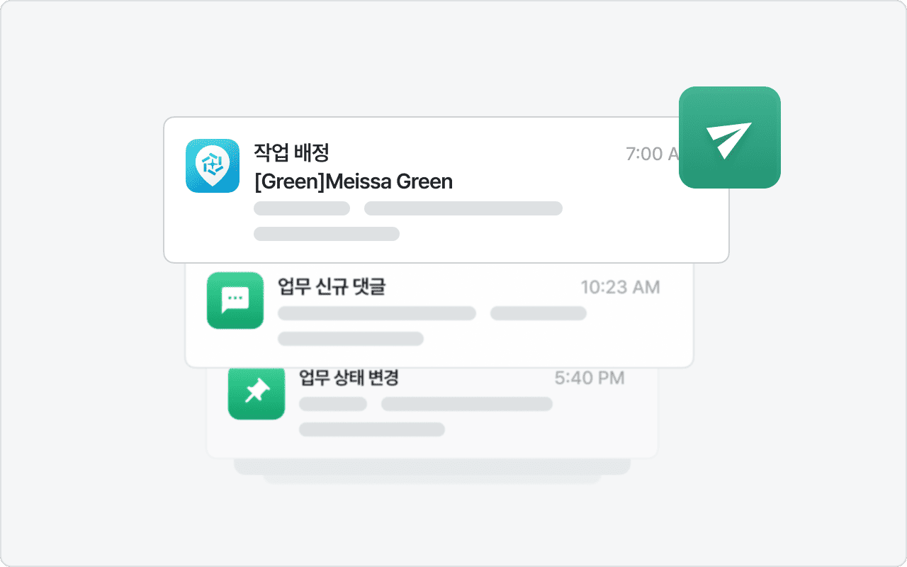 "거기 어디야?", "다 했어?"라는 반복적인 확인 전화와 무전이 사라집니다. 관리자가 작업을 배정하면 실무자에게, 현장 조치 시 관리자에게 실시간으로 알림이 전송됩니다. 또한, 작업자들끼리 지도 기반으로 소통하며 효율적인 현장을 만드세요.