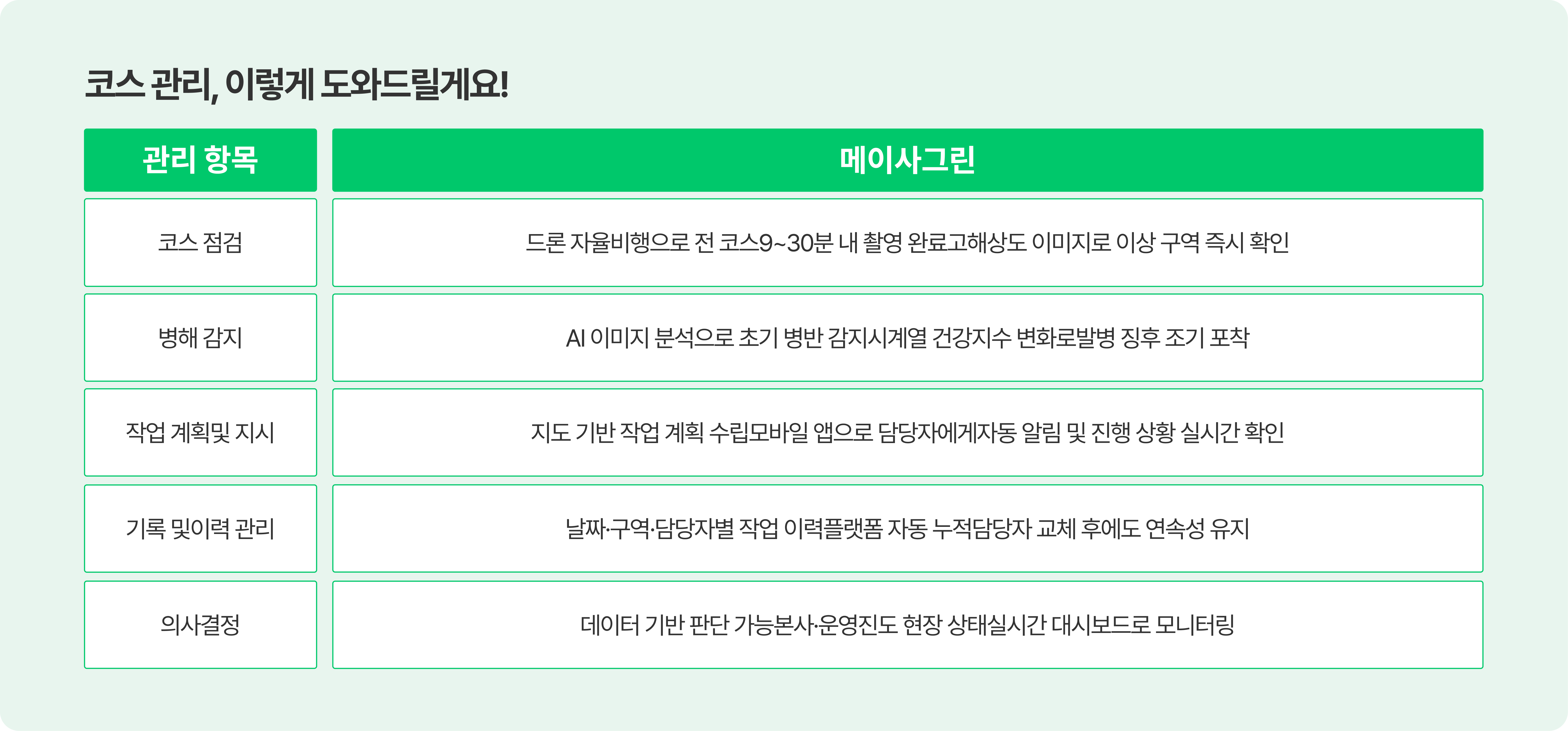 팀장님의 값진 경험에 메이사그린의 똑똑한 데이터를 더해, 한결 여유롭고 완벽해진 코스관리의 일상을 직접 경험해 보세요!