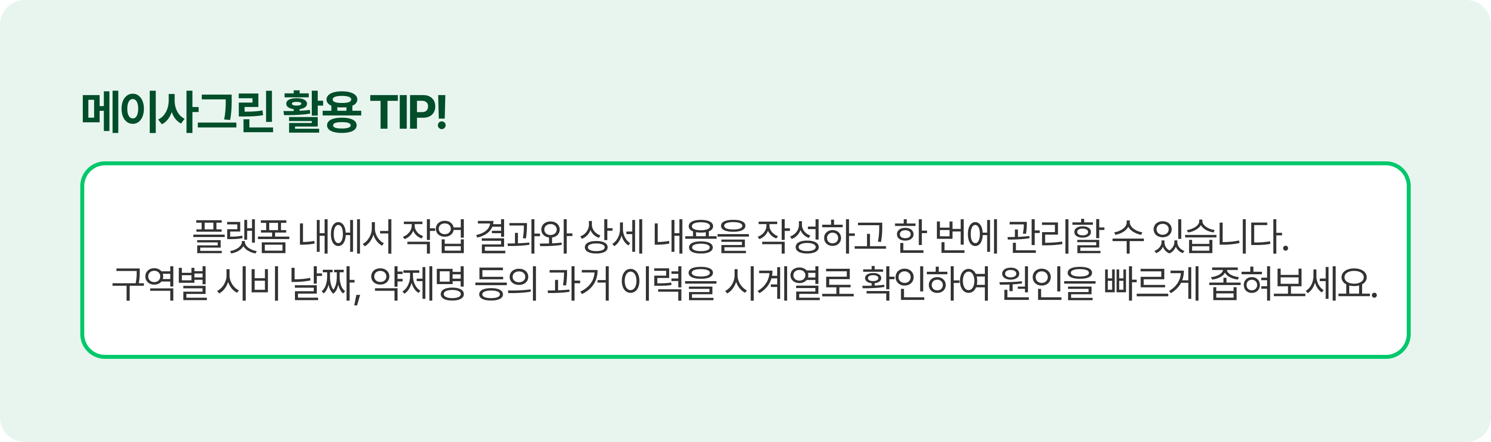 A. 많은 골프장이 겪는 고질적인 인수인계 문제입니다. 메이사그린은 시비 날짜, 약제명, 살포 구역, 작업자 등의 상세 내용을 플랫폼에서 통합 관리합니다. 담당자가 교체되어도 소중한 코스 이력이 완벽하게 보존되므로, 신규 담당자도 데이터를 기반으로 빠르게 코스 특성을 파악할 수 있습니다.